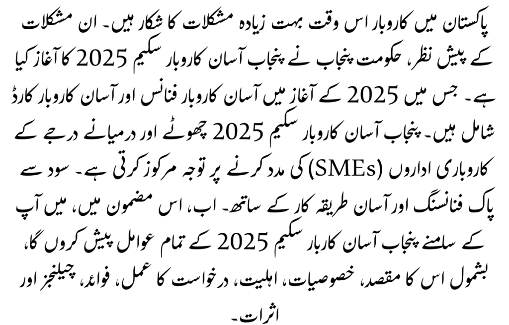 The Punjab Asaan Karobar Scheme 2025 is an initiative by the provincial government of Punjab aimed at kick-starting businesses and upgrading them.
